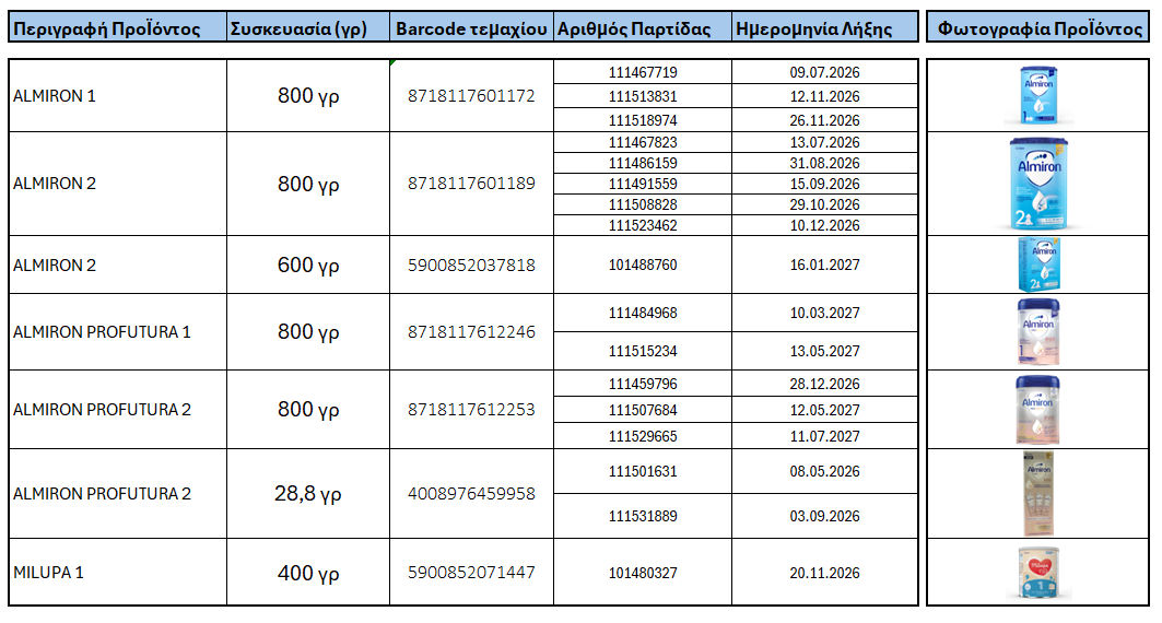 Εθελοντική Ανάκληση Συγκεκριμένων Παρτίδων Βρεφικού Γάλακτος
